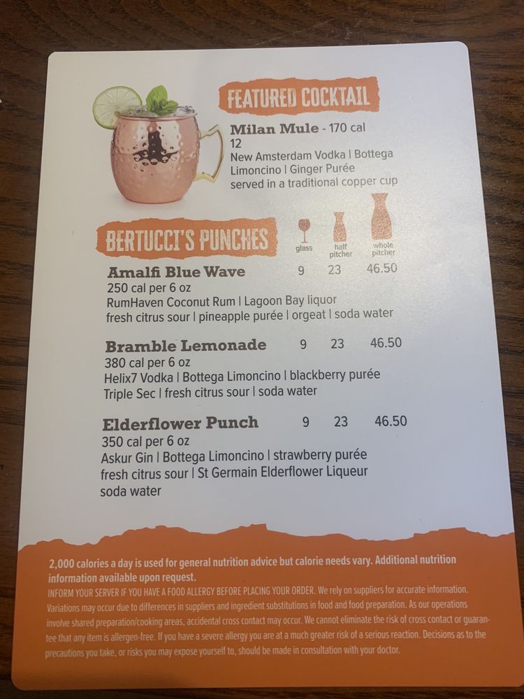 Introducing the menu at Bertucci’s Italian Restaurant, a popular dining spot in Columbia, MD. Known for its diverse selection of Italian dishes, Bertucci’s offers a range of options for vegetarians and meat lovers alike. From classic lasagna and eggplant parm to flavorful ravioli and creamy fettucini alfredo, each dish is prepared with care and served hot. Customers rave about the fresh and delicious flavors, as well as the friendly service provided by the staff. The restaurant also offers catering services, making it a great choice for special events or celebrations. With a spacious dining area, Bertucci’s provides a comfortable and casual atmosphere for guests to enjoy their meals. Whether you're looking for a quick lunch or a leisurely dinner, Bertucci’s is sure to satisfy your craving for authentic Italian cuisine.